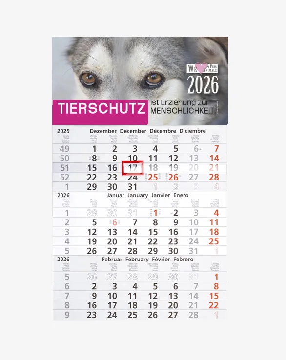 Motiv: HundMaße: 30 x 49 cm- 3-Monats-Kalender mit Datumsschieber und Rückpappe- Einblock-Variante- 4-sprachig- mit Lochung zum Aufhängenkomplett recyclebar