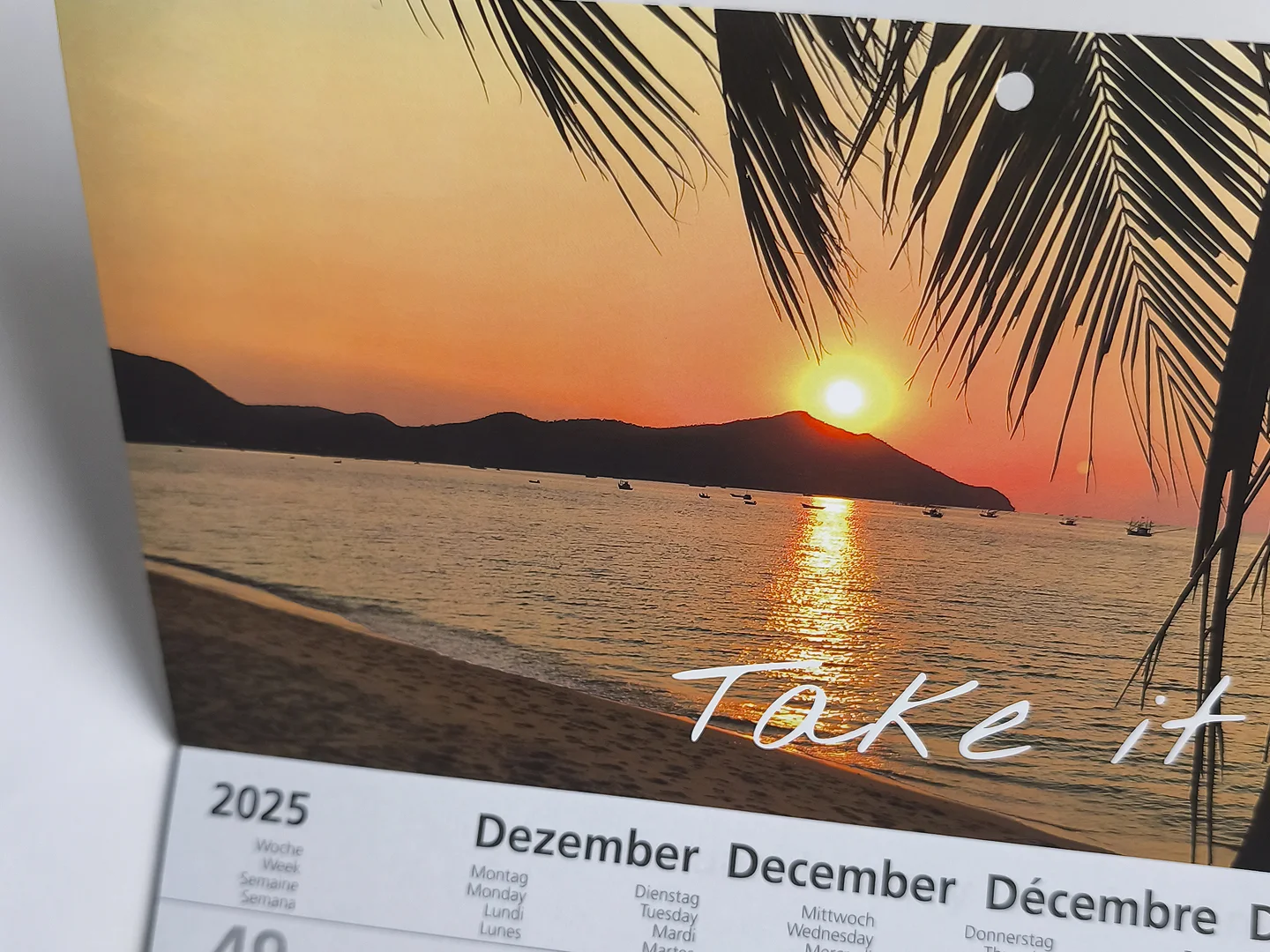 Motiv: Take it easyMaße: 30 x 49 cm- 3-Monats-Kalender mit Datumsschieber und Rückpappe- Einblock-Variante- 4-sprachig- mit Lochung zum Aufhängenkomplett recyclebar