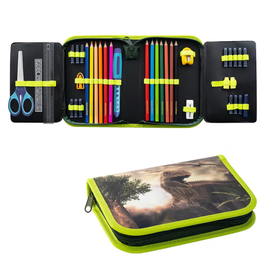 Mit dem 42-teiligen Federmäppchen befüllt Dino von EBERHARD FABER sind Ihre Kinder bestens für den Schulstart ausgestattet. Das hochwertige Federmäppchen mit dekorativem Tier-Motiv besteht aus Polyester und verfügt über 2 Fächer, 2 Innenklappen und jede Menge Schreibutensilien. Der stabile Reißverschluss sorgt dafür, dass Stifte und Co. sicher verstaut sind.