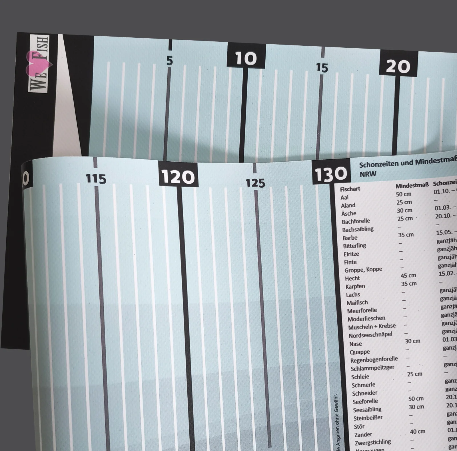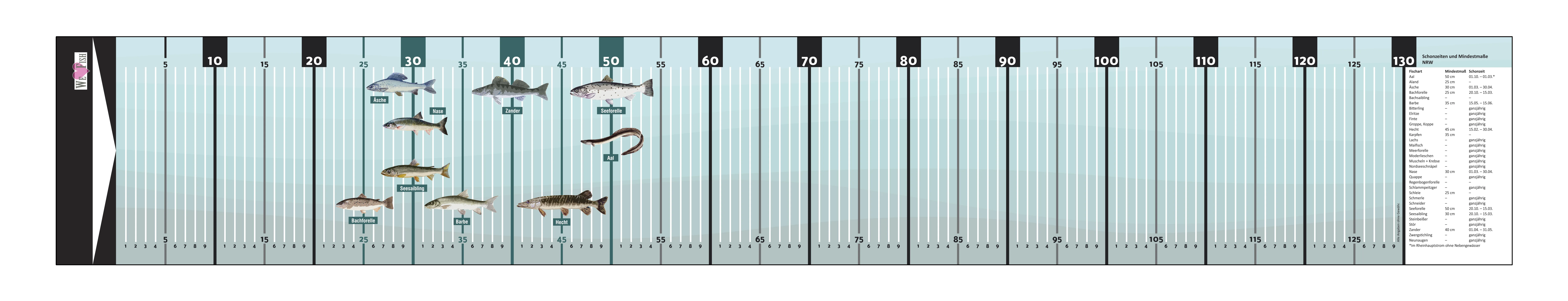 Bemaßung inkl. Angabe von Mindestmaß und Schonzeiten der Fische für das jeweilige Bundesland (befristet, ganzjährig oder keine) lt. Verordnung zum Landesfischereigesetz (Landesfischereiverordnung - LFischVO) des jeweiligen Bundeslandes - inkl. Abbildungen der Fische mit befristeten Schonzeiten (Bilder ähnlich).
