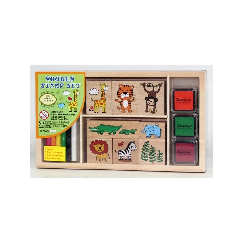 im Holzkasten, Format 23 x 13,5 cm8 Holzstempel (Giraffe, Tiger, Affe, Krokodil, Elefant, Löwe, Zebra & Gras)3 Stempelkissen6 BuntstifteMotive zum Ausmalenhergestellt aus Holz