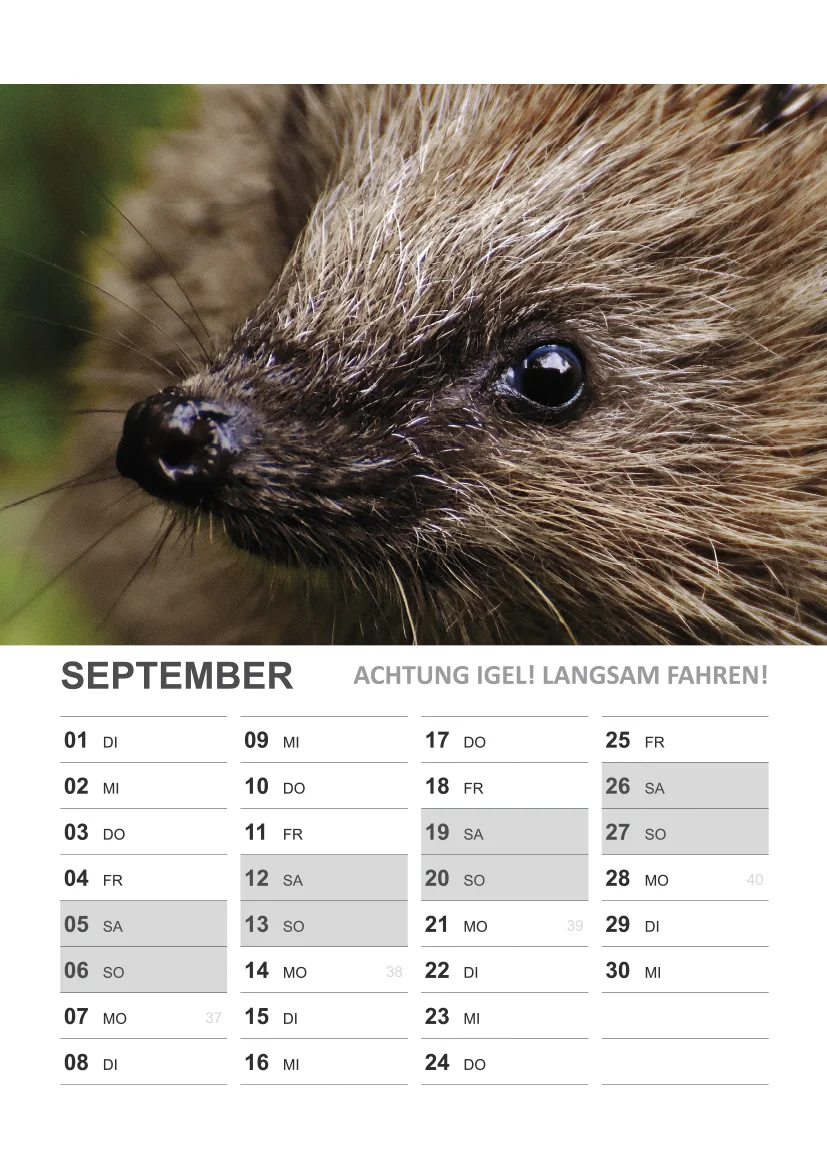 Der Igel Kalender 2026 ist ein realistischer Fotokalender, der Monat für Monat mit liebevollen, situationsgebunden Aufnahmen begeistert. Der Wandkalender im DIN A4 Format bietet eine übersichtliche Kalenderaufteilung mit einem Monat pro Seite und besitzt neben dem Kalendarium Platz für kleine Notizen. Der Igelkalender enthält Fotos, die während der Arbeit der Igelhilfe und Igel-Überwinterungshilfe entstanden sind. Igel-Liebhaber können sich mit diesem Kalender Monat für Monat auf ein neues Igelmotiv freuen.